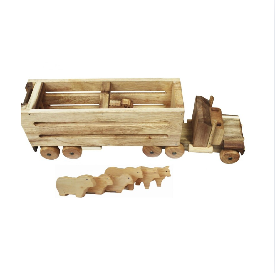 Beautiful hand made castle truck, comes with 6 animals ( 3 sheep, 3 cows). The truck is oiled. the trailer is detachable. This is a quality toy that lasts! All toys are made of plantation timber, using non-toxic, child safe materials. Size60X15X15CM.